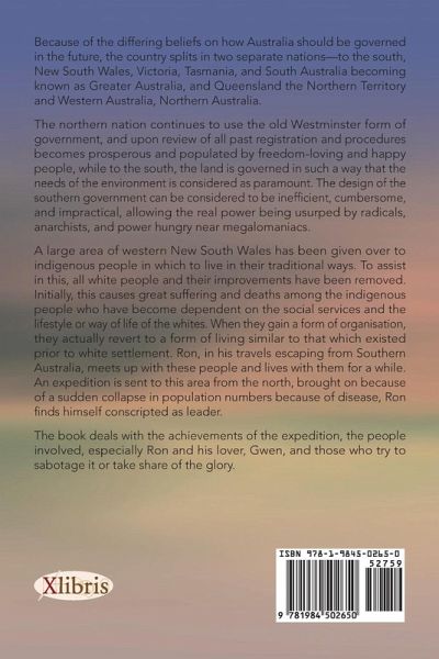 Because of the differing beliefs on how Australia should be governed in the future, the country splits in two separate nations-to the south, New South Wales, Victoria, Tasmania, and South Australia becoming known as Greater Australia, and Queensland the Northern Territory and Western Australia, Northern Australia. The northern nation continues to use the old Westminster form of government, and upon review of all past registration and procedures becomes prosperous and populated by freedom-loving and happy people, while to the south, the land is governed in such a way that the needs of the environment is considered as paramount. The design of the southern government can be considered to be inefficient, cumbersome, and impractical, allowing the real power being usurped by radicals, anarchists, and power hungry near megalomaniacs. A large area of western New South Wales has been given over to indigenous people in which to live in their traditional ways. To assist in this, all white people and their improvements have been removed. Initially, this causes great suffering and deaths among the indigenous people who have become dependent on the social services and the lifestyle or way of life of the whites. When they gain a form of organisation, they actually revert to a form of living similar to that which existed prior to white settlement. Ron, in his travels escaping from Southern Australia, meets up with these people and lives with them for a while. An expedition is sent to this area from the north, brought on because of a sudden collapse in population numbers because of disease, Ron finds himself conscripted as leader. The book deals with the achievements of the expedition, the people involved, especially Ron and his lover, Gwen, and those who try to sabotage it or take share of the glory.
