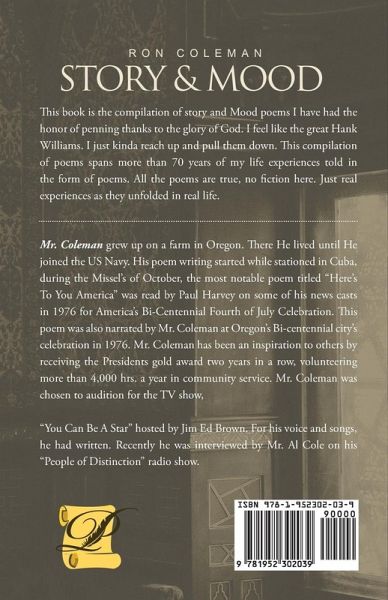 This book is the compilation of story and Mood poems I have had the honor of penning thanks to the glory of God. I feel like the great Hank Williams. I just kinda reach up and pull them down. This compilation of poems spans more than 70 years of my life experiences told in the form of poems. All the poems are true, no fiction here. Just real experiences as they unfolded in real life.