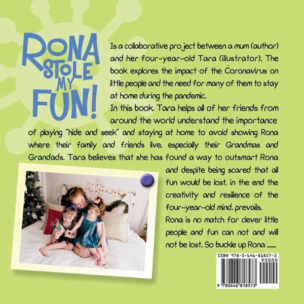 Rona Stole My Fun! is a collaborative project between a mother (author) and her four-year-old daughter, Tara (illustrator). This precious book explores the impact of Coronavirus, social distancing, and recent global changes on children, and is a glimpse in to how one little girl has processed these changes. Through her beautifully (and humorously!) created artworks, Tara tells the story of a naughty Rona and how this creature attempts to steal her fun. The book is a novel way for kindergartens, teachers, parents, grandparents, and carers of young children to view the impact of recent global and local social changes on kids, and to reassure them about the safety of their fun. It is a lovely reminder of the resilience of the four-year-old mind and a tribute to a period in all of our lives when we were forced to reflect on the people and things that mean the most to us. This children's book about social distancing and the love of family and friends, especially grandparents, touches on the impact of isolation from others and the sometimes-funny impacts that might have on us. Rona Stole My Fun! celebrates the importance of children's art and creativity, as Tara pays tribute to her two-year-old sister, whom she has been working with in isolation to create this book. Tara reassures all her little friends from around the world that they can outsmart Rona through a game of hide-and-seek and staying at home, and that fun will ultimately be saved. This will see Rona end up in the "naughty corner" for her bad behaviour and result in rainbows at the end of the story. The creativity and resilience of the four-year-old mind is the ultimate winner. Fun cannot and will not be lost. So buckle up Rona.... Come on a journey with Tara's imagination and help reassure little people that the fun they lost through social distancing, isolation, and kindergarten, swimming class and facility closures, is only temporary. Enjoy the innocence of the illustrations throughout the book and perhaps use them to talk to your children about what the changes have meant to them. A beautiful keepsake during what has been a very extraordinary 2020.