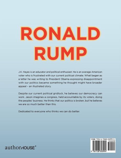 Ronald Rump, How A Spoiled, Entitled, Blustery Little Boy Became President is a book that examines the political conditions in the United States that enabled the election of an inept, inexperienced, egomaniacal narcissist. The story is written and illustrated in the format of a children's book intended to remind readers about how we elected a person so incredibly unqualified for the office of the president. The political context for this book highlights the strategic decision of the Republican Party to intentionally withdraw its participation from any Obama initiatives and actively obstruct his ideas for short term political gain. Additionally, the book points out the Democratic Party's inability or unwillingness to embrace, advocate, or explain Obama era policies. Congressional approval during the Obama administration was at an all-time low. Political infighting, fiscal cliffs, and government shutdowns, amplified by a media that calculates winners and losers rather than policy and outcomes, became the new norm. Because of these forces, Trump was elected. Further, the book reminds us of the speech and tweets of Donald Trump. His vitriol went unchecked by elected leaders and normalized a tone that undermines our values and ideals. Many of the elected leaders in Washington D.C. have put grandstanding, gridlock, and their own re-elections ahead of doing the peoples' business.