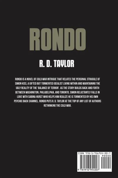 Rondo is a novel of Cold War intrigue that relates to the personal struggle of Simon Kiss. A gifted but tormented idealist living within and maitaining the ugly reality of the balance of terror. As the story builds back and forth between Washington. Philadelphia and Toronto, Simon reluctantly falls in love with Sabina Hurst who helps him realize he is tormented by his own psychic back channel. Rondo puts R.D. Taylor at the top of any list of authors rethinking the Cold War.