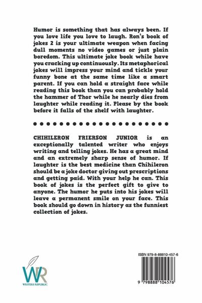 Humor is something that has always been. If you love life you love to laugh. Ron's book of jokes 2 is your ultimate weapon when facing dull moments no video games or just plain boredom. This ultimate joke book while have you cracking up continuously. Its metaphorical jokes will impress your mind and tickle your funny bone at the same time like a smart parent. If you can hold a straight face while reading this book than you can probably hold the hammer of Thor while he nearly dies from laughter while reading it. Please by the book before it falls of the shelf with laughter.