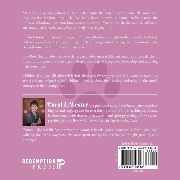 Meet Roo, a quirky, curious cat with a loud purr that can be heard across the room and long legs that let him jump high. Roo has a home he loves, but much to his dismay, the other neighborhood cats shun him because he seems different. One day he wanders off on an adventure, and what begins as fun suddenly turns frightening. He finds himself in an unknown part of the neighborhood, caught in the lures of a steel trap, with no hope of ever reaching home again. He cannot get out of the cage without outside help. But will someone find him and rescue him? Like Roo, children often discover that a person they meet is different, unique, or special, which then affords opportunities to explore deeper meanings of acceptance, friendship, and receiving help from others. Children of all ages will enjoy this lyrical tale of Roo, the Kangaroo Cat. The discussion questions at the end are designed to help children open up about their feelings and to apply the story's concepts to their young lives.
