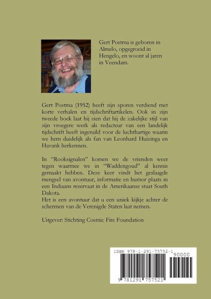 Gert Postma (1952) heeft zijn sporen verdiend met korte verhalen en tijdschriftartikelen. Ook in zijn tweede boek laat hij zien dat hij de zakelijke stijl van zijn vroegere werk als redacteur van een landelijk tijdschrift heeft ingeruild voor de luchthartige waarin we hem duidelijk als fan van Leonhard Huizinga en Havank herkennen. In "Rooksignalen" komen we de vrienden weer tegen waarmee we in "Waddengoud" al kennis gemaakt hebben. Deze keer vindt het geslaagde mengsel van avontuur, informatie en humor plaats in een Indiaans reservaat in de Amerikaanse staat South Dakota. Het is een avontuur dat u een uniek kijkje achter de schermen van de Verenigde Staten laat nemen. Uitgever: Stichting Cosmic Fire Foundation