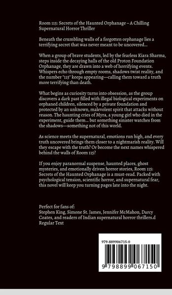 Room 115: Secrets of the Haunted Orphanage - A Chilling Supernatural Horror Thriller Beneath the crumbling walls of a forgotten orphanage lies a terrifying secret that was never meant to be uncovered... When a group of brave students, led by the fearless Kiara Sharma, steps inside the decaying halls of the old Proton Foundation Orphanage, they are drawn into a web of horrifying events. Whispers echo through empty rooms, shadows twist reality, and the number "115" keeps appearing-calling them toward a truth more terrifying than death. What begins as curiosity turns into obsession, as the group discovers a dark past filled with illegal biological experiments on orphaned children, silenced by a private foundation and protected by an unknown, malevolent spirit that attacks without reason. The haunting cries of Myra, a young girl who died in the experiment, guide them... but something sinister watches from the shadows-something not of this world. As science meets the supernatural, emotions run high, and every truth uncovered brings them closer to a nightmarish reality. Will they escape with the truth? Or become the next names whispered behind the walls of Room 115? If you enjoy paranormal suspense, haunted places, ghost mysteries, and emotionally driven horror stories, Room 115: Secrets of the Haunted Orphanage is a must-read. Packed with psychological tension, scientific horror, and supernatural fear, this novel will keep you turning pages late into the night.