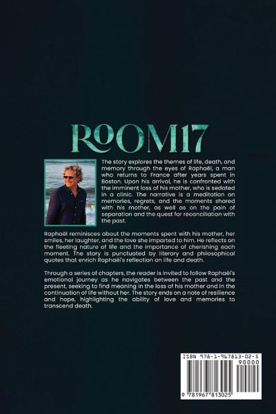 In ROOM17, Raphaël returns to France after years in Boston to face the imminent death of his mother, who lies sedated in a clinic. As he sits by her bedside, he embarks on a deeply emotional journey through memory, regret, and the quiet intimacy of their shared past. Through fleeting moments, fragments of laughter, and the profound silence of goodbye, Raphaël reflects on the love that shaped him and the fragility of life itself. Interwoven with philosophical and literary quotes, the novel contemplates the beauty of impermanence and the enduring imprint of those we love. Told in lyrical prose and structured as a series of reflections, ROOM17 invites the reader into a space of vulnerability, where time slows and emotions swell. It is a moving tribute to the quiet strength of maternal love and the resilience found in remembrance. For readers who cherish introspective literary fiction, ROOM17 offers a poignant and unforgettable reading experience-one that lingers long after the final page.