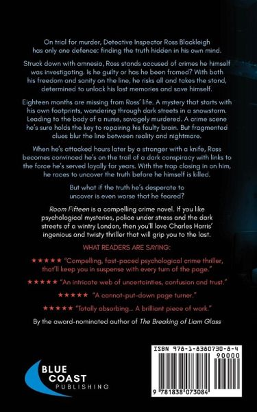 A gripping psychological thriller: A murder he can't remember. A truth he might not survive. On trial for murder, Detective Inspector Ross Blackleigh has only one defence: finding the truth hidden in his own mind. Struck down with amnesia, Ross stands accused of crimes he himself was investigating. Is he guilty or has he been framed? With both his freedom and sanity on the line, he risks all and takes the stand, determined to unlock his lost memories and save himself. Eighteen months are missing from Ross's life. A mystery that starts with his own footprints, wandering through dark streets in a snowstorm. Leading to the body of a nurse, savagely murdered. A crime scene he's sure holds the key to repairing his faulty brain. But fragmented clues blur the line between reality and nightmare. When he's attacked hours later by a stranger with a knife, Ross becomes convinced he's on the trail of a dark conspiracy with links to the force he's served loyally for years. With the trap closing in on him, he races to uncover the truth before he himself is killed. But what if the truth he's desperate to uncover is even worse that he feared? Room Fifteen is a compelling crime novel. If you like psychological mysteries, police under stress and the dark streets of a wintry London, then you'll love Charles Harris's ingenious and twisty thriller that will grip you to the last page.