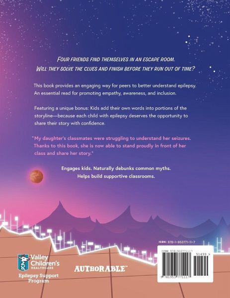 Four friends find themselves in an escape room. Will they solve the clues and finish before they run out of time? This book provides an engaging way for peers to better understand epilepsy. An essential read for promoting empathy, awareness, and inclusion. Featuring a unique bonus: Kids add their own words into portions of the storyline-because each child with epilepsy deserves the opportunity to share their story with confidence. "My daughter's classmates were struggling to understand her seizures. Thanks to this book, she is now able to stand proudly in front of her class and share her…mehr