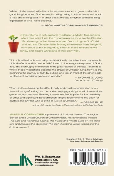 Wise, encouraging pastoral reflections on growing in Christ "When I clothe myself with Jesus, he leaves me room to grow — which is a good thing because, God knows, I'm still growing. I put on Jesus as I would a new and ill-fitting outfit — in order that someday it might fit and be a fitting expression of who I have become." — from Martin Copenhaver's preface In this volume of rich pastoral meditations, Martin Copenhaver offers rare insight into the myriad ways we try to live the Christian life, showing us that there is indeed "room to grow" in Christ and into the Christian faith. Moving seamlessly from the gently humorous to the thoughtfully serious, these reflections will renew and inspire Christians in their daily walk.