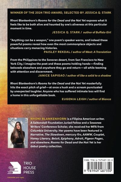 Winner of the 2024 Trio Award, Rooms for the Dead and the Not Yet explores landscapes of grief, desire, and identity. How does memory collapse time? In what ways do mourning and longing echo each other? What violence persists beneath narrative and aesthetic surfaces, upholding systems of belief and power? This debut poetry collection revolves around imagination as an act of resilience and rebellion. Blankenhorn's speaker communes with dead beloveds while buttering toast, petting dogs, kissing lovers, looking at art, holding hands with friends, and traversing cities and deserts. The beauty and comedy of daily life becomes a provocation into nonlinearity, sexuality, family history, and multiracial selfhood. Slipping between exterior and interior with an unflinching gaze, Rooms for the Dead and the Not Yet invites us to embrace the impossible complexity of human experience.