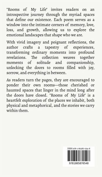 "Rooms of My Life" invites readers on an introspective journey through the myriad spaces that define our existence. Each poem serves as a window into the intimate corners of memory, love, loss, and growth, allowing us to explore the emotional landscapes that shape who we are. With vivid imagery and poignant reflections, the author crafts a tapestry of experiences, transforming ordinary moments into profound revelations. The collection weaves together moments of solitude and companionship, unlocking the doors to rooms filled with joy, sorrow, and everything in between. As readers turn the pages, they are encouraged to ponder their own rooms-those cherished or haunted spaces that linger in the mind long after the doors have closed. "Rooms of My Life" is a heartfelt exploration of the places we inhabit, both physical and metaphorical, and the stories we carry within them.