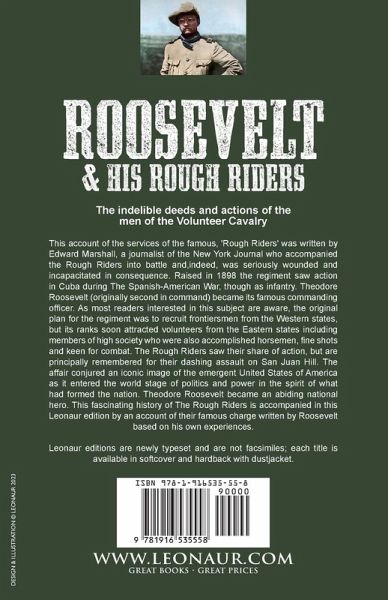 The indelible deeds and actions of the men of the Volunteer Cavalry This account of the services of the famous, 'Rough Riders' was written by Edward Marshall, a journalist of the New York Journal who accompanied the Rough Riders into battle and,indeed, was seriously wounded and incapacitated in consequence. Raised in 1898 the regiment saw action in Cuba during The Spanish-American War, though as infantry. Theodore Roosevelt (originally second in command) became its famous commanding officer. As most readers interested in this subject are aware, the original plan for the regiment was to recruit frontiersmen from the Western states, but its ranks soon attracted volunteers from the Eastern states including members of high society who were also accomplished horsemen, fine shots and keen for combat. The Rough Riders saw their share of action, but are principally remembered for their dashing assault on San Juan Hill. The affair conjured an iconic image of the emergent United States of America as it entered the world stage of politics and power in the spirit of what had formed the nation. Theodore Roosevelt became an abiding national hero. This fascinating history of The Rough Riders is accompanied in this Leonaur edition by an account of their famous charge written by Roosevelt based on his own experiences.