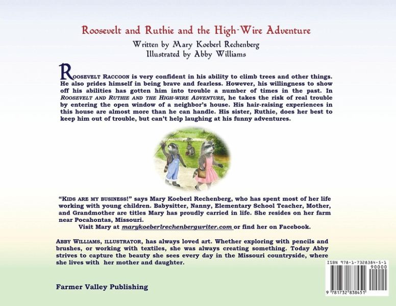 Roosevelt Raccoon is very confident in his ability to climb trees and other things. He also prides himself in being brave and fearless. However, his willingness to show off his abilities has gotten him into trouble a number of times in the past. In Roosevelt and Ruthie and the High-wire Adventure, he takes the risk of real trouble by entering the open window of a neighbor's house. His hair-raising experiences in this house are almost more than he can handle. His sister, Ruthie, does her best to keep him out of trouble, but can't help laughing at his funny adventures. Read more about the adventures of Roosevelt and Ruthie in the book Roosevelt and Ruthie and the Fish That Got Away.