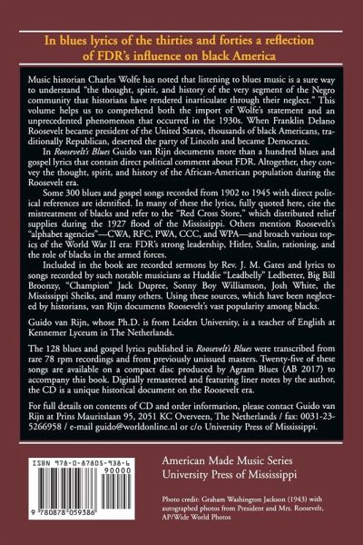 Association of Recorded Sound Collections Awards for Excellence Recorded Gospel Music (1998) In Roosevelt's Blues, Guido van Rijn documents more than a hundred blues and gospel lyrics that contain direct political comment about FDR. Altogether, they convey the thought, spirit, and history of the African-American population during the Roosevelt era. Included in the book are recorded sermons by Rev. J. M. Gates and lyrics to songs recorded by such notable musicians as Huddie "Leadbelly" Ledbetter, Big Bill Broonzy, "Champion" Jack Dupree, Sonny Boy Williamson, Josh White, the Mississippi Sheiks, and many others. Using these sources, which have been neglected by historians, van Rijn documents Roosevelt's vast popularity among Black people.