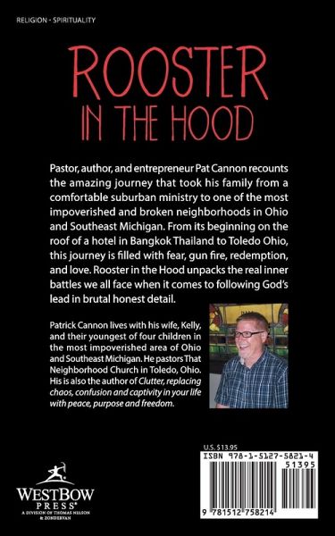 Pastor, author, and entrepreneur Pat Cannon recounts the amazing journey that took his family from a comfortable suburban ministry to one of the most impoverished and broken neighborhoods in Ohio and Southeast Michigan. From its beginning on the roof of a hotel in Bangkok Thailand to Toledo Ohio, this journey is filled with fear, gun fire, redemption, and love. Rooster in the Hood unpacks the real inner battles we all face when it comes to following God’s lead in brutal honest detail.