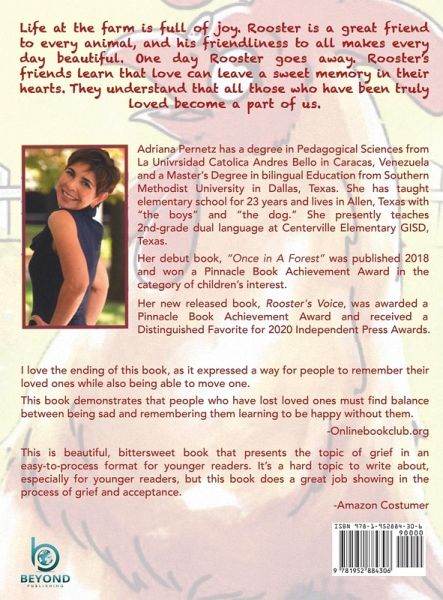 Life at the farm is full of joy. Rooster is a great friend to every animal, and his friendliness to all makes every day beautiful. One day Rooster goes away. Rooster's friends learn that love can leave a sweet memory in their hearts. They understand that all those who have been truly loved become a part of us. Adriana Pernetz has a degree in Pedagogical Sciences from La Universidad Catolica Andres Bello in Caracas, Venezuela and a Master's degree in Bilingual Education from Southern Methodist University in Dallas, Texas. She has taught elementary school for 23 years and lives in Allen, Texas…mehr