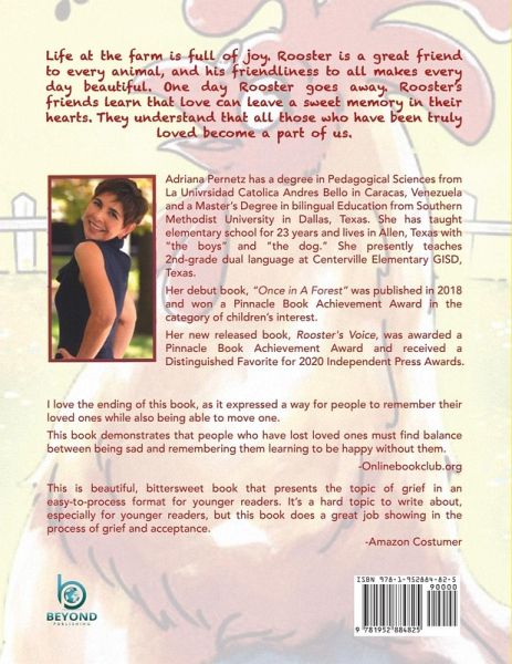Life at the farm is full of joy. Rooster is a great friend to every animal, and his friendliness to all makes every day beautiful. One day Rooster goes away. Rooster's friends learn that love can leave a sweet memory in their hearts. They understand that all those who have been truly loved become a part of us. Adriana Pernetz has a degree in Pedagogical Sciences from La Universidad Catolica Andres Bello in Caracas, Venezuela and a Master's degree in Bilingual Education from Southern Methodist University in Dallas, Texas. She has taught elementary school for 23 years and lives in Allen, Texas with "the boys" and "the dog". She presently teaches 2nd-grade dual language at Centerville Elementary GISD, Texas. Her debut book, Once in a Forest was published 2018 and won a Pinnacle Book Achievement Award in the category of children's interest. I loved the ending of this book, as it expressed a way for people to remember their loved ones while also being able to move on. This book demonstrates that people who have lost loved ones must find a balance between being sad and remembering them and learning to be happy without them. This is a beautiful, bittersweet book that presents the topic of grief in an easy-to-process format for younger readers. It's a hard topic to write about, especially for younger readers, but this book does a great job showing in the process of grief and acceptance.