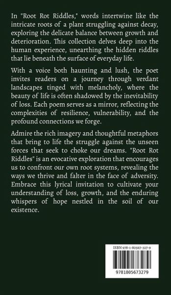 In "Root Rot Riddles," words intertwine like the intricate roots of a plant struggling against decay, exploring the delicate balance between growth and deterioration. This collection delves deep into the human experience, unearthing the hidden riddles that lie beneath the surface of everyday life. With a voice both haunting and lush, the poet invites readers on a journey through verdant landscapes tinged with melancholy, where the beauty of life is often shadowed by the inevitability of loss. Each poem serves as a mirror, reflecting the complexities of resilience, vulnerability, and the profound connections we forge. Admire the rich imagery and thoughtful metaphors that bring to life the struggle against the unseen forces that seek to choke our dreams. "Root Rot Riddles" is an evocative exploration that encourages us to confront our own root systems, revealing the ways we thrive and falter in the face of adversity. Embrace this lyrical invitation to cultivate your understanding of loss, growth, and the enduring whispers of hope nestled in the soil of our existence.