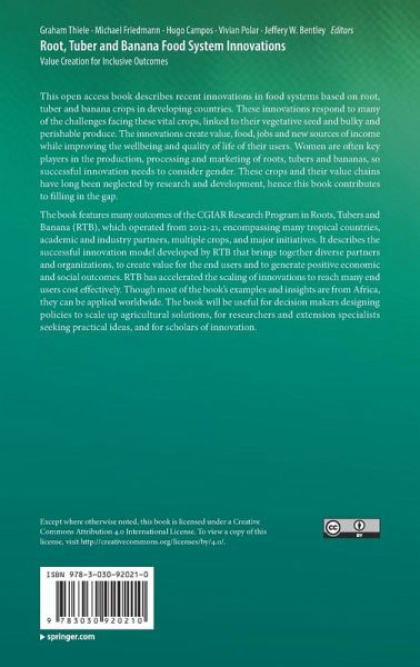 This open access book describes recent innovations in food systems based on root, tuber and banana crops in developing countries. These innovations respond to many of the challenges facing these vital crops, linked to their vegetative seed and bulky and perishable produce. The innovations create value, food, jobs and new sources of income while improving the wellbeing and quality of life of their users. Women are often key players in the production, processing and marketing of roots, tubers and bananas, so successful innovation needs to consider gender. These crops and their value chains have long been neglected by research and development, hence this book contributes to filling in the gap.