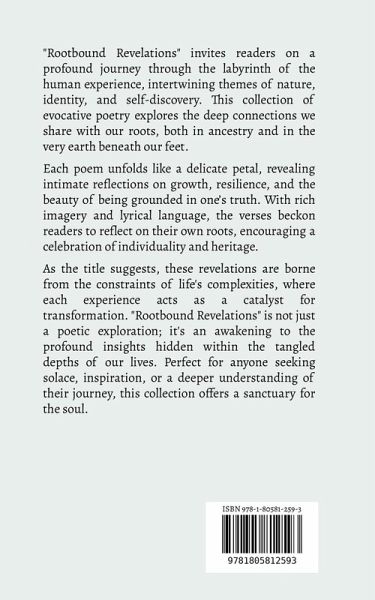 "Rootbound Revelations" invites readers on a profound journey through the labyrinth of the human experience, intertwining themes of nature, identity, and self-discovery. This collection of evocative poetry explores the deep connections we share with our roots, both in ancestry and in the very earth beneath our feet. Each poem unfolds like a delicate petal, revealing intimate reflections on growth, resilience, and the beauty of being grounded in one's truth. With rich imagery and lyrical language, the verses beckon readers to reflect on their own roots, encouraging a celebration of individuality and heritage. As the title suggests, these revelations are borne from the constraints of life's complexities, where each experience acts as a catalyst for transformation. "Rootbound Revelations" is not just a poetic exploration; it's an awakening to the profound insights hidden within the tangled depths of our lives. Perfect for anyone seeking solace, inspiration, or a deeper understanding of their journey, this collection offers a sanctuary for the soul.