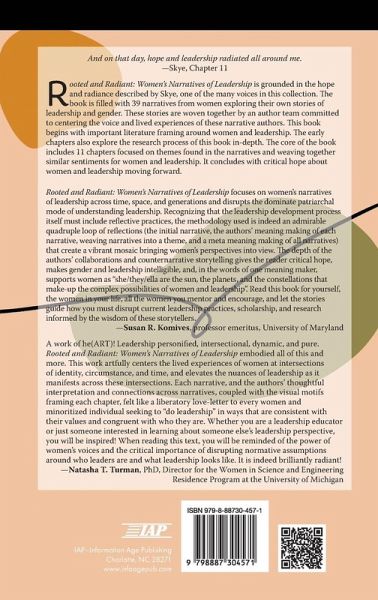 Rooted and Radiant: Women's Narratives of Leadership shares the narratives of 39 women navigating the process of leadership. It seeks to honor the unique experiences of the narrative authors while also challenging the dominant stories of the leadership process. The audience for the book is leadership educators and women looking to further explore leadership as a phenomenon. Rooted and Radiant: Women's Narratives of Leadership is grounded in the hope and radiance described by Skye, one of the many voices in this collection, where she described how "leadership radiated all around me." The book is filled with narratives from women exploring their own stories of leadership and gender. These stories are woven together by an author team committed to centering the voices and lived experiences of these narrative authors. This book begins with important literature framing women and leadership. The early chapters also explore the research process of this book in-depth. The core of the book includes chapters focused on critical themes found in the 39 narratives and weaving together women's narratives of understanding and enacting leadership. The book concludes with critical hope about women and leadership moving forward.