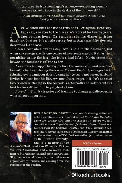 "A loving coming-of-age story for women in mid-life. Brava!" -Adriana Trigiani, Author of The Good Left Undone ". . . captures the true meaning of resilience-something so many women strive to know in the depths of their inner-self." -Sister Robbie Pentecost, OSF former Executive Director of the New Opportunity School for Women Ava Winston likes her life of routine in Lexington, Kentucky. Each day, she goes to the place she's worked for twenty years, then returns home. On Sundays, she has dinner with her daughter, Juniper. It's a little boring, but as Ava nears fifty-five, she deserves a bit of ease. Then a tornado blows it away. Ava is safe in the basement, but when she emerges, only one corner of her home stands. Rather than crumbling under the loss, she feels a load lifted. Maybe something beyond the familiar is calling to her. Ava seizes the opportunity to find the owner of a suitcase that landed on her lawn during the storm. Meanwhile, Juniper urges her to rebuild, Ava's employer doesn't want her to quit, and her ex-husband invites her back into his life. Ava must be courageous if she's to assist two friends suffering in the tornado's aftermath and balance what's best for herself and for the people she loves. Rooted in Sunrise is a story of learning to change and discovering what is most important.