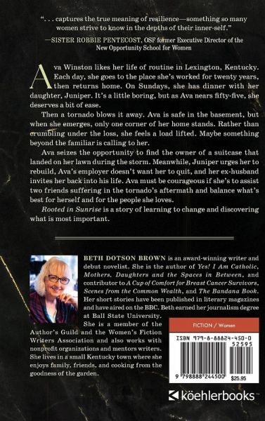 "A loving coming-of-age story for women in mid-life. Brava!" -Adriana Trigiani, Author of The Good Left Undone ". . . captures the true meaning of resilience-something so many women strive to know in the depths of their inner-self." -Sister Robbie Pentecost, OSF former Executive Director of the New Opportunity School for Women Ava Winston likes her life of routine in Lexington, Kentucky. Each day, she goes to the place she's worked for twenty years, then returns home. On Sundays, she has dinner with her daughter, Juniper. It's a little boring, but as Ava nears fifty-five, she deserves a bit of ease. Then a tornado blows it away. Ava is safe in the basement, but when she emerges, only one corner of her home stands. Rather than crumbling under the loss, she feels a load lifted. Maybe something beyond the familiar is calling to her. Ava seizes the opportunity to find the owner of a suitcase that landed on her lawn during the storm. Meanwhile, Juniper urges her to rebuild, Ava's employer doesn't want her to quit, and her ex-husband invites her back into his life. Ava must be courageous if she's to assist two friends suffering in the tornado's aftermath and balance what's best for herself and for the people she loves. Rooted in Sunrise is a story of learning to change and discovering what is most important.