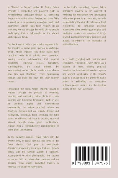 "Rooted In Texas: A Guide to Native Landscaping and Rewilding" by R. Blaine Odom " In "Rooted In Texas," author R. Blaine Odom presents a compelling and practical guide to revolutionizing landscape design by harnessing the power of native plants, flowers, and trees. With a strong focus on promoting ecological health and biodiversity, Odom's book takes readers on an enriching journey through the world of sustainable landscaping that is tailor-made for the vibrant landscapes of Texas. The book opens with a persuasive argument for the adoption of native plant species in landscape design. Odom explains how these plants have coevolved with local wildlife over centuries, forming crucial relationships that support pollinators, beneficial insects, butterflies, hummingbirds, and small animals. By incorporating native plants, readers are shown how they can effortlessly create harmonious habitats that invite life back into their outdoor spaces. Throughout the book, Odom expertly navigates readers through the process of selecting, planning, and cultivating native plants to create stunning and functional landscapes. With an eye for aesthetic appeal and environmental sustainability, he offers practical advice on designing gardens that are visually striking and ecologically beneficial. From choosing the right plants for different soil types to creating seasonal interest through clever plant combinations, readers gain a comprehensive understanding of native plant landscaping. As the narrative unfolds, Odom delves into the diverse array of native species that thrive in the Texas climate. Each plant is meticulously described, showcasing its unique features, growth habits, and the specific wildlife it supports. Accompanied by vivid photographs, this section serves as both an informative resource and an inspiring visual guide, motivating readers to embrace the beauty of native flora. In the concluding chapters of the book, Odom introduces readers to the concept of rewilding. He emphasizes how landscaping with native plants is a critical step towards reestablishing the delicate balance of local ecosystems. By providing essential information about rewilding principles and strategies, readers are empowered to go beyond traditional gardening practices and actively contribute to the restoration of natural habitats. "Rooted In Texas" culminates in a call to action, urging readers to become ambassadors of change in their communities. Armed with the knowledge and enthusiasm gained from the book, readers are encouraged to spearhead native plant initiatives, advocate for sustainable landscaping practices, and inspire others to embrace the beauty and benefits of a rewilded landscape. In a world grappling with environmental challenges, "Rooted In Texas" stands as a beacon of hope, offering practical solutions for transforming outdoor spaces into vibrant sanctuaries of life. Odom's book is a testament to the power of native plants in rekindling the connection between people, nature, and the timeless beauty of the Texas landscape.