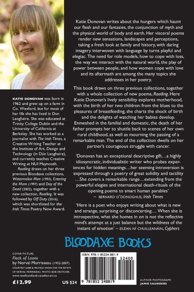 Katie Donovan was educated at Trinity College Dublin and The University of California at Berkeley. She has published five books of poetry, all with Bloodaxe Books: Watermelon Man (1993), Entering the Mare (1997), Day of the Dead (2002), Rootling: New & Selected Poems (2010), and Off Duty (2016), which was shortlisted for the Irish Times-Poetry Now Award. Born in 1962, she spent her childhood on a farm in Co. Wexford before moving to Dún Laoghaire, a suburb of Dublin where she still lives. She has worked as a journalist with The Irish Times, a Creative Writing Teacher at the Institute of Art, Design and Technology (in Dún Laoghaire), and currently teaches Creative Writing at NUI Maynooth. Her work has been widely anthologised, most recently in The Wake Forest Book of Irish Women's Poetry, edited by Peggy O'Brien, and in Bloodaxe's Staying Alive: Real Poems for Unreal Times, edited by Neil Astley. She is the author of Irish Women Writers: Marginalised by Whom? (Raven Arts Press, 1988), and has co-edited two anthologies, Dublines (with Brendan Kennelly), published by Bloodaxe Books in 1996, and Ireland's Women: Writings Past and Present (with A. Norman Jeffares and Brendan Kennelly), published by Kyle Cathie (Britain) and Gill and Macmillan (Ireland) in 1994. In 2017 she was awarded the 21st Lawrence O'Shaughnessy Award for Poetry.