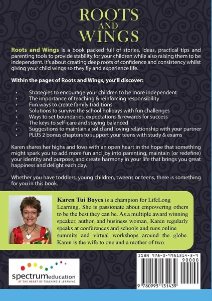 ROOTS AND WINGS is a book packed full of stories, ideas, practical tips and parenting tools to provide stability for your children while also raising them to be independent. It's about creating deep roots of confidence and consistency whilst giving your child wings so they can fly and experience life. Within the pages of ROOTS AND WINGS, you'll discover: ¿ Strategies to encourage your children to be more independent ¿ The importance of teaching & reinforcing responsibility ¿ Fun ways to create family traditions ¿ Solutions to survive the school holidays with fun challenges ¿ Ways to set boundaries, expectations & rewards for success ¿ The keys to self-care and staying balanced ¿ Suggestions to maintain a solid and loving relationship with your partner ¿ PLUS 2 bonus chapters to support your teens with study & exams Karen shares her highs and lows with an open heart in the hope that something might spark you to add more fun and joy into your parenting journey, maintain (or redefine) your identity and purpose, and create harmony in your life that brings you great happiness and delight each day. Whether you have toddlers, young children, tweens or teens, there is something for you in this book.