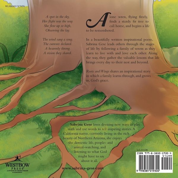 A spot in the sky, Her flight was the way. She flew up so high, Observing the lay. The wind sang a song. The currents declared. A heavenly throng. A vision they shared. A lone wren, flying freely, finds a sturdy fir tree to call home, and begins a life to be remembered. In a beautifully written inspirational poem, Sabrina Gese leads others through the stages of life by following a family of wrens as they learn to live with and love each other. Along the way, they gather the valuable lessons that life brings every day to their nest and beyond. Roots and Wings shares an inspirational story in which a family learns through, and grows in, God's grace.