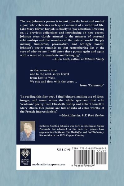 As the seasons turn one to the next, so we travel from East to West. We rise and flow with the years ... from "Ceremony" "To read Johnson's poems is to look into the heart and soul of a poet who celebrates each quiet moment of a well-lived life. Like Mary Oliver, her job is clearly to 'pay attention.' Drawing on 12 previous collections and introducing 15 new poems, Johnson stays closely attuned to the nuances of personal relationships and the wonders of the natural world. Deeply moving, humorous, provocative, and achingly honest, Johnson's poetry reminds us that remembering lies at the core of who we are. I will enter these poems again and again with a sense of camaraderie and belonging." --Ellen Lord, author of Relative Sanity "In reading this fine poet, I find Johnson making use of ideas, images, and tones across the whole spectrum that echo 'academic' poetry from Elizabeth Bishop and Robert Lowell to Mary Oliver. Her poems are full of dabs of color worthy of the French Impressionists." --Mack Hassler, U.P. Book Review