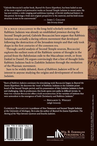 In a bold challenge to the long-held scholarly notion that Rabbinic Judaism was already an established presence during the Second Temple period, Gabriele Boccaccini here argues that Rabbinic Judaism was actually a daring reform movement that developed following the destruction of the Jerusalem temple and that only took shape in the first centuries of the common era. Through careful analysis of Second Temple sources, Boccaccini explores the earliest roots of the Rabbinic system of thought in the period from the Babylonian exile to the Maccabean revolt, or from Ezekiel to Daniel. He argues convincingly that a line of thought links Rabbinic Judaism back to Zadokite Judaism through the mediation of the Pharisaic movement. Sure to be widely debated, Roots of Rabbinic Judaism will be of interest to anyone studying the origins and development of modern Judaism.