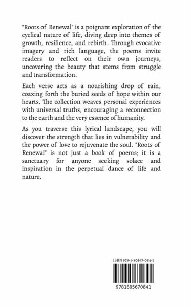 "Roots of Renewal" is a poignant exploration of the cyclical nature of life, diving deep into themes of growth, resilience, and rebirth. Through evocative imagery and rich language, the poems invite readers to reflect on their own journeys, uncovering the beauty that stems from struggle and transformation. Each verse acts as a nourishing drop of rain, coaxing forth the buried seeds of hope within our hearts. The collection weaves personal experiences with universal truths, encouraging a reconnection to the earth and the very essence of humanity. As you traverse this lyrical landscape, you will discover the strength that lies in vulnerability and the power of love to rejuvenate the soul. "Roots of Renewal" is not just a book of poems; it is a sanctuary for anyone seeking solace and inspiration in the perpetual dance of life and nature.