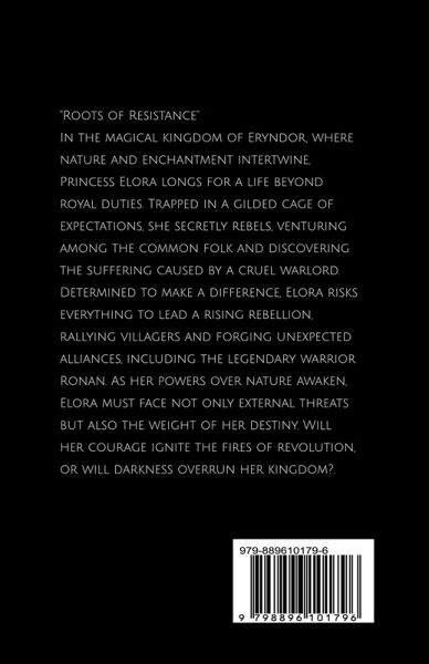 "Roots of Resistance" In the magical kingdom of Eryndor, where nature and enchantment intertwine, Princess Elara longs for a life beyond royal duties. Trapped in a gilded cage of expectations, she secretly rebels, venturing among the common folk and discovering the suffering caused by a cruel warlord. Determined to make a difference, Elara risks everything to lead a rising rebellion, rallying villagers and forging unexpected alliances, including the legendary warrior Kael. As her powers over nature awaken, Elara must face not only external threats but also the weight of her destiny. Will her courage ignite the fires of revolution, or will darkness overrun her kingdom?.