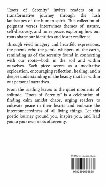 "Roots of Serenity" invites readers on a transformative journey through the lush landscapes of the human spirit. This collection of poignant verses intertwines themes of nature, self-discovery, and inner peace, exploring how our roots shape our identities and foster resilience. Through vivid imagery and heartfelt expressions, the poems echo the gentle whispers of the earth, reminding us of the serenity found in connecting with our roots-both in the soil and within ourselves. Each piece serves as a meditative exploration, encouraging reflection, healing, and a deeper understanding of the beauty that lies within our personal narratives. From the rustling leaves to the quiet moments of solitude, "Roots of Serenity" is a celebration of finding calm amidst chaos, urging readers to cultivate peace in their hearts and embrace the interconnectedness of all living things. Let this poetic journey ground you, inspire you, and lead you to your own roots of serenity.