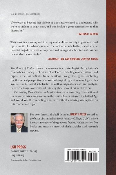 The Roots of Violent Crime in America is criminologist Barry Latzer's comprehensive analysis of crimes of violence--including murder, assault, and rape--in the United States from the 1880s through the 1930s. Combining the theoretical perspectives and methodological rigor of criminology with a synthesis of historical scholarship as well as original research and analysis, Latzer challenges conventional thinking about violent crime of this era. While scholars have traditionally cast American cities in the late nineteenth and early twentieth centuries as dreadful places, Latzer suggests that despite overcrowding and poverty, U.S. cities enjoyed low rates of violent crime, especially when compared to rural areas. The rural South and the thinly populated West both suffered much higher levels of brutal crime than the metropolises of the East and Midwest. Latzer deemphasizes racism and bigotry as causes of violence during this period, noting that while many social groups confronted significant levels of discrimination and abuse, only some engaged in high levels of violent crime. Cultural predispositions and subcultures of violence, he posits, led some groups to participate more frequently in violent activity than others. He also argues that the prohibition on alcohol in the 1920s did not drive up rates of violent crime. Though the bootlegger wars contributed considerably to the murder rate in some of America's largest municipalities, Prohibition also eliminated saloons, which served as hubs of vice, corruption, and lawlessness. The Roots of Violent Crime in America stands as a sweeping reevaluation of the causes of crimes of violence in the United States between the Gilded Age and World War II, compelling readers to rethink enduring assumptions on this contentious topic.
