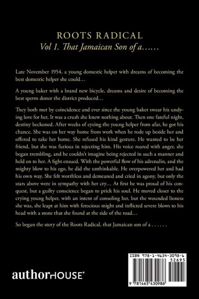 Late November 1954, a young domestic helper with dreams of becoming the best domestic helper she could... A young baker with a brand new bicycle, dreams and desire of becoming the best sperm donor the district produced... They both met by coincidence and ever since the young baker swear his undying love for her, It was a crush she knew nothing about. Then one fateful night, destiny beckoned. After weeks of eyeing the young helper from afar, he got his chance. She was on her way home from work when he rode up beside her and offered to take her home. She refused his kind gesture. He wanted to be her friend, but she was furious in rejecting him. His voice roared with anger, she began trembling, and he couldn't imagine being rejected in such a manner and held on to her. A fight ensued. With the powerful flow of his adrenalin, and the mighty blow to his ego, he did the unthinkable. He overpowered her and had his own way. She felt worthless and demeaned and cried in agony, but only the stars above were in sympathy with her cry... At first he was proud of his conquest, but a guilty conscience began to prick his soul. He moved closer to the crying young helper, with an intent of consoling her, but the wounded lioness she was, she leapt at him with ferocious might and inflicted severe blows to his head with a stone that she found at the side of the road... So began the story of the Roots Radical, that Jamaican son of a . . . . . .