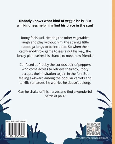 Nobody knows what kind of veggie he is. But will kindness help him find his place in the sun? Rooty feels sad. Hearing the other vegetables laugh and play without him, the strange little rutabaga longs to be included. So when their catch-and-throw game tosses a nut his way, the lonely plant seizes his chance to meet new friends. Confused at first by the curious pair of peppers who come across to retrieve their toy, Rooty accepts their invitation to join in the fun. But feeling awkward among the popular carrots and terrific tomatoes, he worries he doesn't belong. Can he shake off his nerves and find a wonderful patch of pals? Rooty the Rutabaga is the first tale in the Rooty the Rutabaga children's book series, suitable for ages 3-8 and can be read as a standalone. Including an activity section filled with fun facts, if you and your child like cute characters, beautifully illustrated images, and learning positive messages, then you'll love Steven Megson's well-tended plot. Buy Rooty the Rutabaga today for a sweet story of friendship!