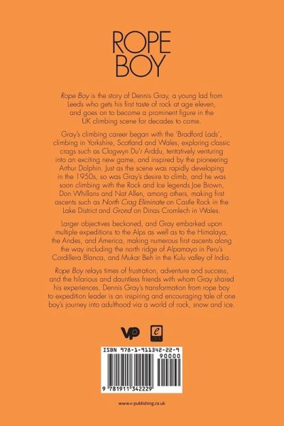 Rope Boy is the story of Dennis Gray, a young lad from Leeds who gets his first taste of rock at age eleven, and goes on to become a prominent figure in the UK climbing scene for decades to come. Gray’s climbing career began with the ‘Bradford Lads’, climbing in Yorkshire, Scotland and Wales, exploring classic crags such as Clogwyn Du’r Arddu, tentatively venturing into an exciting new game, and inspired by the pioneering Arthur Dolphin. Just as the scene was rapidly developing in the 1950s, so was Gray’s desire to climb, and he was soon climbing with the Rock and Ice legends Joe Brown, Don Whillans and Nat Allen, among others, making first ascents such as North Crag Eliminate on Castle Rock in the Lake District and Grond on Dinas Cromlech in Wales. Larger objectives beckoned, and Gray embarked upon multiple expeditions to the Alps as well as to the Himalaya, the Andes, and America, making numerous first ascents along the way including the north ridge of Alpamayo in Peru’s Cordillera Blanca, and Mukar Beh in the Kulu valley of India. Rope Boy relays times of frustration, adventure and success, and the hilarious and dauntless friends with whom Gray shared his experiences. Dennis Gray’s transformation from rope boy to expedition leader is an inspiring and encouraging tale of one boy’s journey into adulthood via a world of rock, snow and ice.