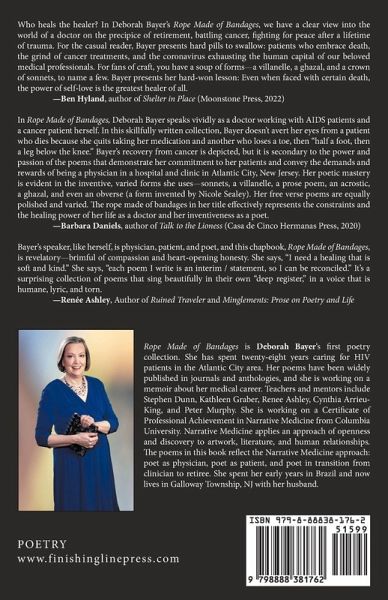 Rope Made of Bandages contains poems that describe the end of a woman physician's career during a pandemic. She grieves over her patients' losses of life and limb. She transitions into being a writer. Her path includes her own cancer journey. Exploration of spirituality sees her through grief and burnout. She ends in a place of surrender to her craft.