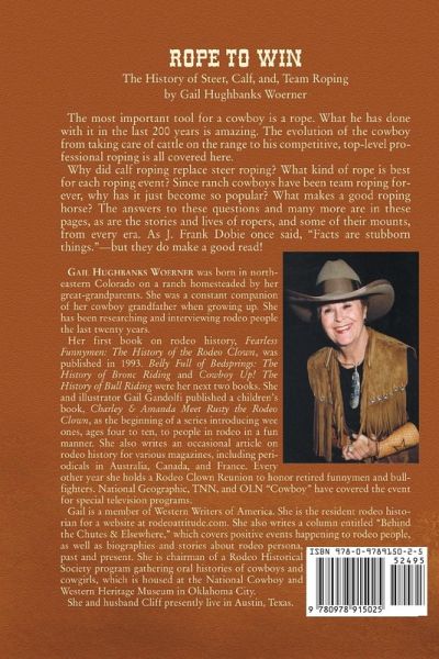Gail Woerner was born and raised on a ranch in northeastern Colorado and worked with cattle and broke horses with her grandfather. She has written several books on the history of rodeo, a children's book on rodeo and numerous articles in various western-related magazines and periodicals including magazines in France, Canada and Australia. She also reviews other writer's books several times a year, and continually answers questions about rodeo from e-mail queries from around the globe. Gail is the Chairman of the Rodeo Clown Reunion which is held at various rodeos across the nation and generally has forty retired laugh-getters, bullfighters and barrelmen attend. They don their familiar make-up and costumes and sign autographs and entertain the fans. She also writes a newsletter to numerous retired rodeo clowns and their widows monthly.She received the Academy of Western Artists Will Rogers Medallion Award for Western Nonfiction for her book entitled, "Rope to Win, The History of Steer, Calf and Team Roping" in 2008. She received the American Cowboy Culture Award for Western Writing at the National Cowboy Symposium held in Lubbock, TX, in 2009. Gail lives in Austin, Texas, with her husband, Cliff.