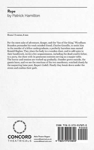 Genre: Drama Characters: 6 males, 2 females Scenery: Interior For the mere sake of adventure, danger, and the "fun of the thing," Wyndham Brandon persuades his weak minded friend, Charles Granillo, to assist him in the murder of a fellow undergraduate, a perfectly harmless man named Ronald Raglan. They place the body in a wooden chest, and to add spice to their handiwork, invite a few acquaintances, including the dead youth's father, to a party, the chest with its gruesome contents serving as a supper table. The horror and tension are worked up gradually; thunder grows outside, the guests leave, and we see the reactions of the two murderers, watched closely by the suspecting lame poet, Rupert Cadell. Finally they break down under the strain and confess their guilt.