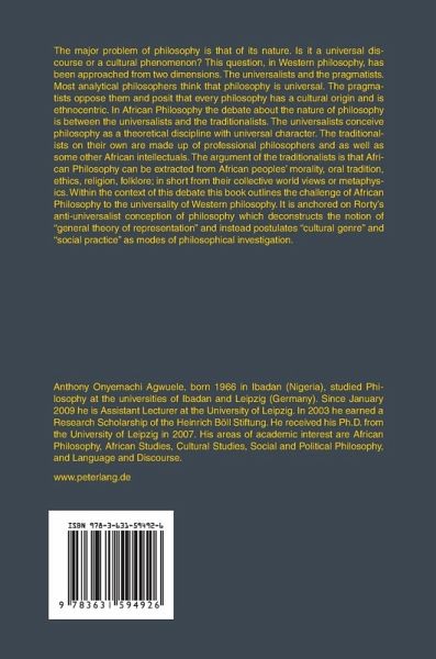 The major problem of philosophy is that of its nature. Is it a universal discourse or a cultural phenomenon? This question, in Western philosophy, has been approached from two dimensions. The universalists and the pragmatists. Most analytical philosophers think that philosophy is universal. The pragmatists oppose them and posit that every philosophy has a cultural origin and is ethnocentric. In African Philosophy the debate about the nature of philosophy is between the universalists and the traditionalists. The universalists conceive philosophy as a theoretical discipline with universal character. The traditionalists on their own are made up of professional philosophers and as well as some other African intellectuals. The argument of the traditionalists is that African Philosophy can be extracted from African peoples' morality, oral tradition, ethics, religion, folklore; in short from their collective world views or metaphysics. Within the context of this debate this book outlines the challenge of African Philosophy to the universality of Western philosophy. It is anchored on Rorty's anti-universalist conception of philosophy which deconstructs the notion of "general theory of representation" and instead postulates "cultural genre" and "social practice" as modes of philosophical investigation.