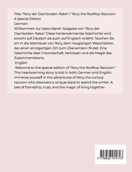 Title: "Rory der Dachboden-Rabe" / "Rory the Rooftop Raccoon: A Special Edition" German: Willkommen zur besonderen Ausgabe von "Rory der Dachboden-Rabe." Diese herzerwärmende Geschichte wird sowohl auf Deutsch als auch auf Englisch erzählt. Tauchen Sie ein in die Abenteuer von Rory, dem neugierigen Waschbären, der einen einzigartigen Ort zum Überwintern findet. Eine Geschichte über Freundschaft, Vertrauen und die Magie des Zusammenlebens. English: Welcome to the special edition of "Rory the Rooftop Raccoon." This heartwarming story is told in both German and English. Immerse yourself in the adventures of Rory, the curious raccoon who discovers a unique place to spend the winter. A tale of friendship, trust, and the magic of living together.