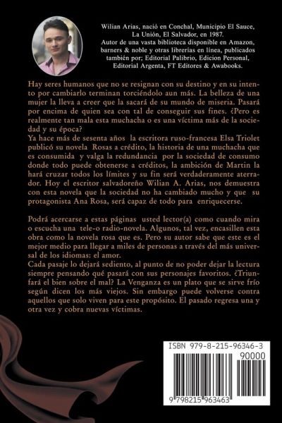 Ya hace más de sesenta años la escritora ruso-francesa Elsa Triolet publicó su novela Rosas a crédito, la historia de una muchacha que es consumida ¿y valga la redundanciä por la sociedad de consumo donde todo puede obtenerse a créditos, la ambición de Martin la hará cruzar todos los límites y su fin será verdaderamente aterrador. Hoy el escritor salvadoreño Wilian A. Arias, nos demuestra con esta novela que la sociedad no ha cambiado mucho y que su protagonista Ana Rosa, será capaz de todo para enriquecerse. Podrá acercarse a estas páginas usted lector(a) como cuando mira o escucha una tele-o radio-novela. Algunos, tal vez, encasillen esta obra como la novela rosa que es. Pero su autor sabe que este es el mejor medio para llegar a miles de personas a través del más universal de los idiomas: el amor. Cada pasaje lo dejará sediento, al punto de no poder dejar la lectura siempre pensando qué pasará con sus personajes favoritos. ¿Triunfará el bien sobre el mal? La Venganza es un plato que se sirve frío según dicen los más viejos. Sin embargo puede volverse contra aquellos que solo viven para este propósito. El pasado regresa una y otra vez y cobra nuevas víctimas. Verdes eran los campos, boyantes colores habían entre las flores, donde sobresalía el rojo. Ella confundió el verde con el verde de los billetes y el rojo, con la sangre de sus víctimas. Conoce más de nuestra; Ana Rosa, la mujer que nació pobre de alma y rica de ambición. Así piensa la protagonista de esta historia, Ana Rosa: […] y mi cabeza dirige al corazón y no sé quien irá a vencerme, ¿el amor o el dinero? […] yo tenía que hacer lo que fuere por un poco o mucho dinero y para ello activé mi credi cuerpo, o sea, mi cuerpo sirvió para complacerme en todo lo que yo quería […] esta es mi historia, la historia de la Credi Cuerpo.
