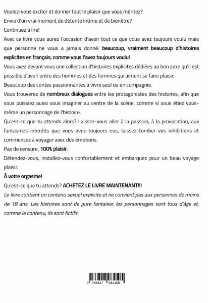 Voulez-vous exciter et donner tout le plaisir que vous méritez?Envie d'un vrai moment de détente intime et de bienêtre?Continuez à lire!Avec ce livre vous aurez l'occasion d'avoir tout ce que vous avez toujours voulu mais que personne ne vous a jamais donné: beaucoup, vraiment beaucoup d'histoires explicites en français, comme vous l'avez toujours voulu!Vous avez devant vous une collection d'histoires explicites dédiées au bon sexe qu'il est possible d'avoir entre des hommes et des femmes qui aiment se faire plaisir. Beaucoup des contes passionnantes à vivre seul ou en compagnie.Vous trouverez de nombreux dialogues entre les protagonistes des histoires, afin que vous puissiez aussi vous imaginer au centre de la scène, comme si vous étiez vous-même un personnage de l'histoire.Qu'est-ce que tu attends alors? Laissez-vous aller à la passion, à la provocation, aux fantasmes interdits que vous avez toujours eus, laissez tomber vos inhibitions et commencez à voyager avec des émotions.Pas de censure, 100 pour 100 de plaisir.Détendez-vous, installez-vous confortablement et embarquez pour un beau voyage plaisir.À votre orgasme!