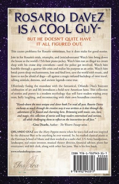 Rosario Davez is a cool guy- but he doesn't quite have it all figured out. This causes problems for Rosario sometimes, but it does make for good stories. Join in for Rosario's trials, triumphs, and (mis)adventures! Watch him bring down the house as the world's 15th-best piano jockey. Watch him run an illegal ice cream shop with his cruise ship coworkers-until the police get involved. Watch him bumble through a quarter-life crisis and realize his purpose as an artist. Watch him break pawn-shop enchantments, lose and find love, save the world with music, and learn to not be afraid of dogs-all against a magic-infused backdrop of time travel, demons, and ancient legends come true. Effortlessly fusing the mundane with the fantastical, Orlando Diaz's buoyant celebration of art and life introduces a bold new American hero. This collection of stories is a modern mythology that will have readers wiping away tears, belly laughing, and reconnecting with their own boundless creativity.
