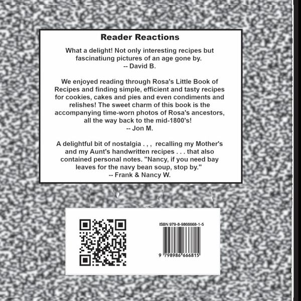 A collection of 60 handwritten recipes from the author's mother, alternating with photographs of family members and friends between 1890 and 1980. There are no pictures of prepared dishes because most are simple and delicious desserts like grandma used to make. In a short preface, the author shares recollections of childhood when he and his family enjoyed many of the dishes in the book. 8" x 8", 140 pp.