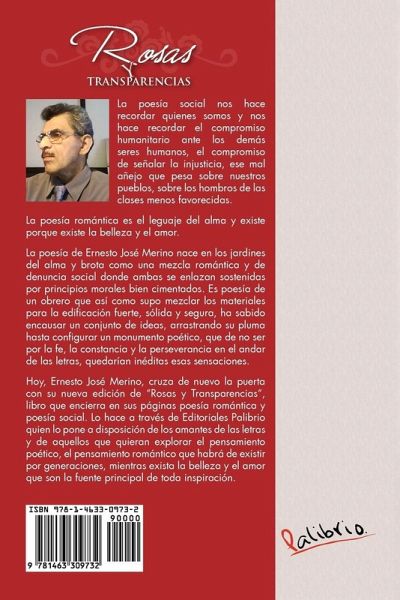 La poesía social nos hace recordar quienes somos y nos hace recordar el compromiso humanitario ante los demás seres humanos, el compromiso de señalar la injusticia,ese mal añejo que pesa sobrenuestros pueblos, sobre los hombros de las clases menos favorecidas. La poesía romántica es el leguaje del almay existe porque existe la belleza y el amor. La poesía de Ernesto José Merino nace en los jardines del alma y brota como una mezcla romántica y de denuncia social donde ambas se enlazan sostenidas por principios morales bien cimentados.Es poesía de un obrero que así como supo mezclar los materiales para la edificación fuerte, sólida y segura, ha sabido encausar un conjunto de ideas, arrastrando su pluma hasta configurar un monumento poético, que de no ser por la fe, la constancia y la perseverancia en el andar de las letras, quedarían inéditas esas sensaciones. Hoy,Ernesto José Merino, cruza de nuevo la puerta con su nueva edición de "Rosas y Transparencias", libro que encierra en sus páginas poesía romántica y poesía social. Lo hace a través de Editoriales Palibrio quien lo pone a disposición de los amantes de las letras y de aquellos que quieran explorar el pensamiento poético, el pensamiento romántico que habrá de existir por generaciones, mientras exista la belleza y el amor que son la fuente principal de toda inspiración.